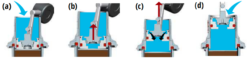 (a) Sāciet ar nolaistu sviru un piepildiet brūvēšanas cilindru ar ūdeni līdz malai. (b) Paceliet sviru pietiekami, lai atbrīvotu kātu un atvērtu vārstu, ļaujot ūdenim piepildīt zemāk esošo brīvo telpu (kustiniet sviru, lai samazinātu gaisa kabatas). (c) Turpiniet lēnām celt sviru, un ūdens plūdīs caur vārstu un brūvēšanas kamerā. (d) Kad svira ir pilnībā pacelta, uzpildiet kameru caur atveri, kas izveidota starp kātu un virzuli.