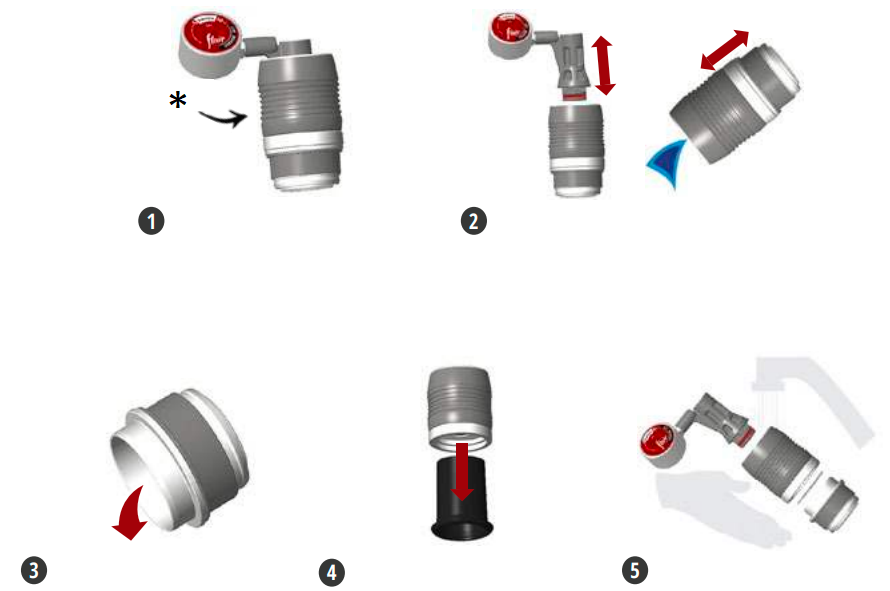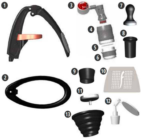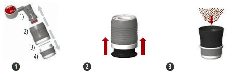 1. Atdaliet brūvēšanas galviņu — sadaliet to četrās daļās: 1) Virzulis 2) Brūvēšanas cilindrs ar virzuli 3) Siets 4) Portafiltrs.