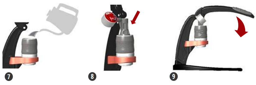 7. Piepildiet cilindru ar vārītu ūdeni — piepildiet savu PRO 3 cilindru caur virzuli tikai ar vārītu ūdeni.