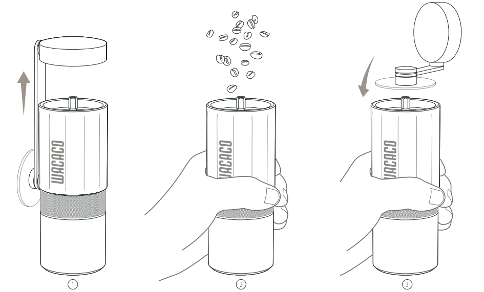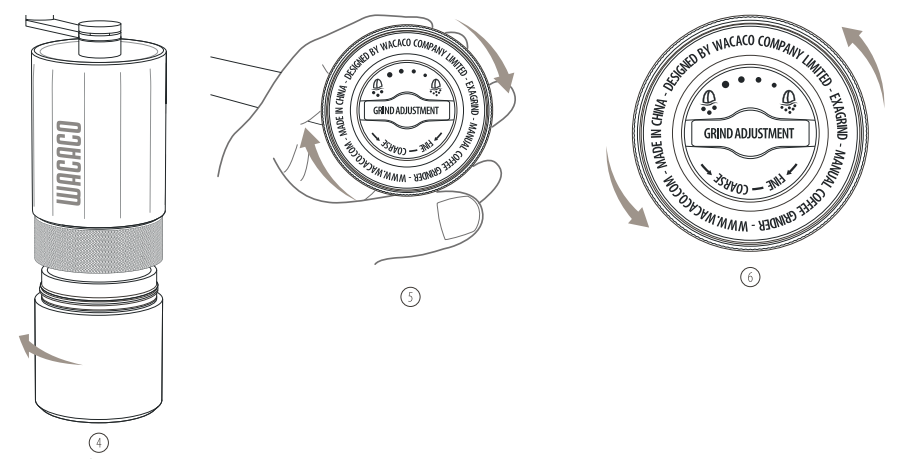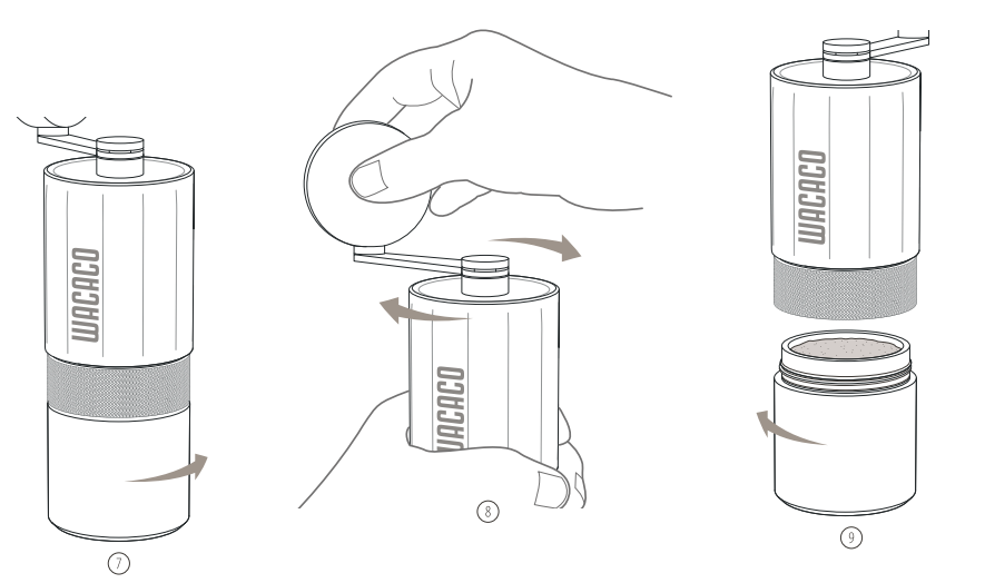 8. Turiet galveno korpusu vienā rokā un ar otru roku pagrieziet rokturi pulksteņrādītāja virzienā, līdz visas pupiņas ir samaltas.