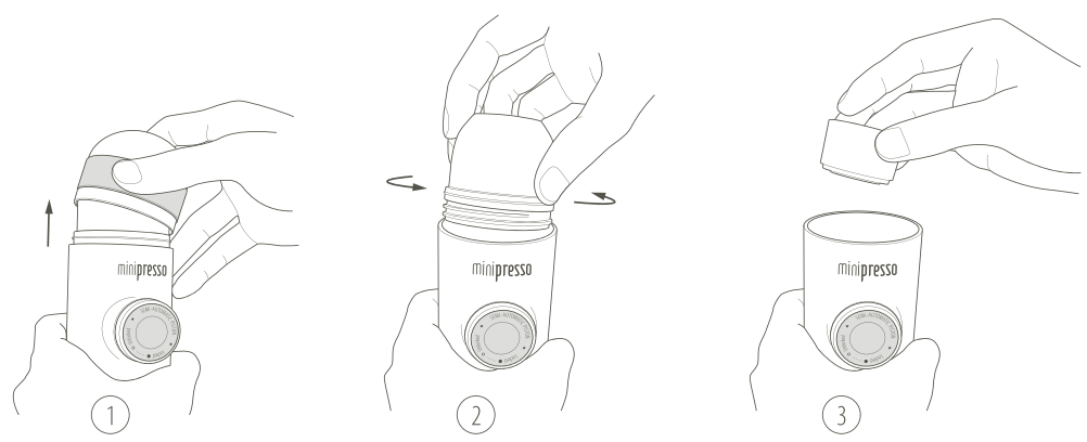 - Uzkarsējiet visas MiniPresso daļas, kā arī krūzi, palaižot ciklu tikai ar karstu ūdeni.