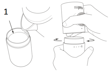 Piepildiet ūdens tvertni atbilstoši riskam. Novietojiet sava MiniPresso korpusu pretī punktam uz tvertnes un uzlieciet to uz tvertnes, pagriežot pulksteņrādītāja virzienā.